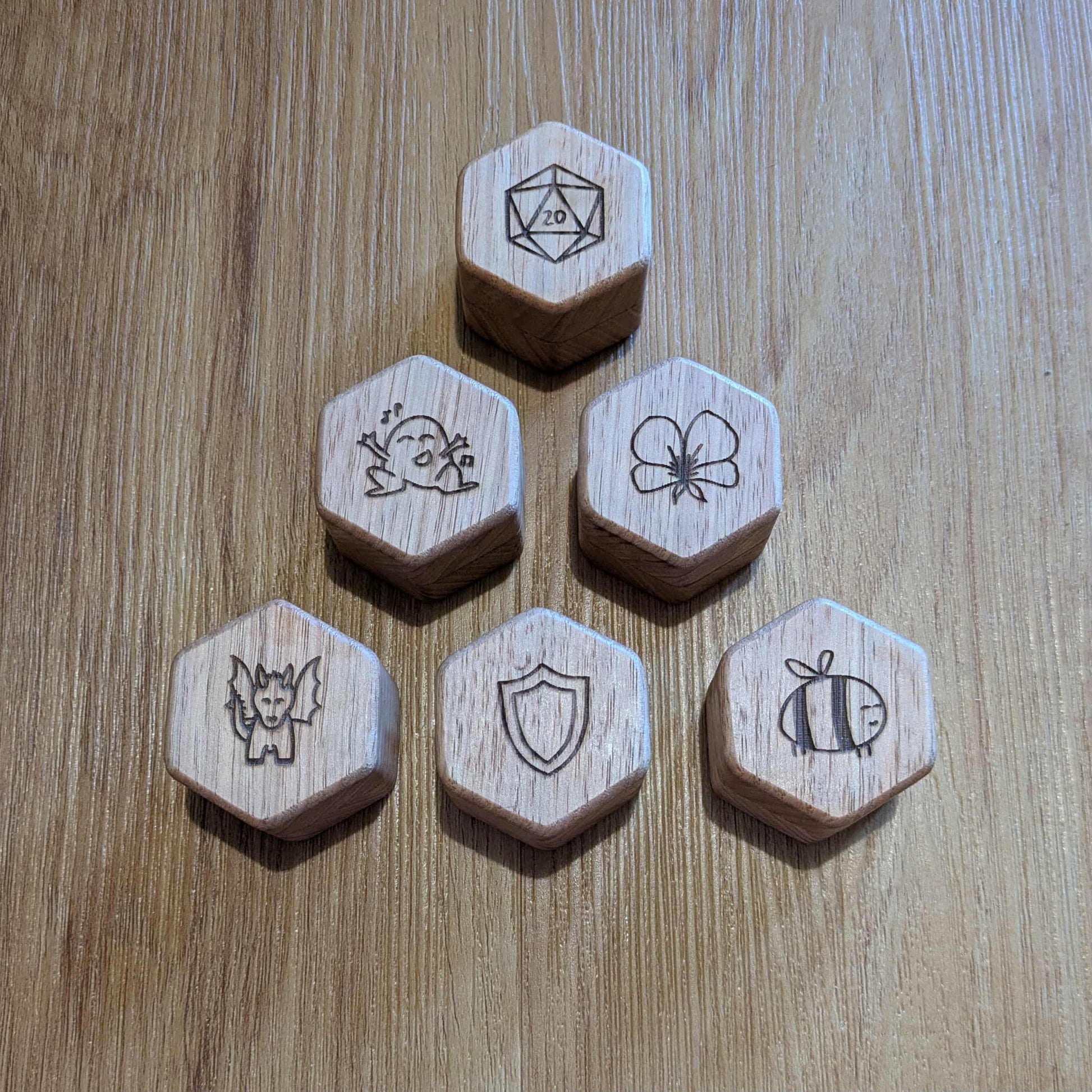 Each box is laser-engraved with one of our six designs (D20, Dragon, Bee, Dancing Frog, Flower, or Shield) and the box is comfortably sized for standard D20 dice.