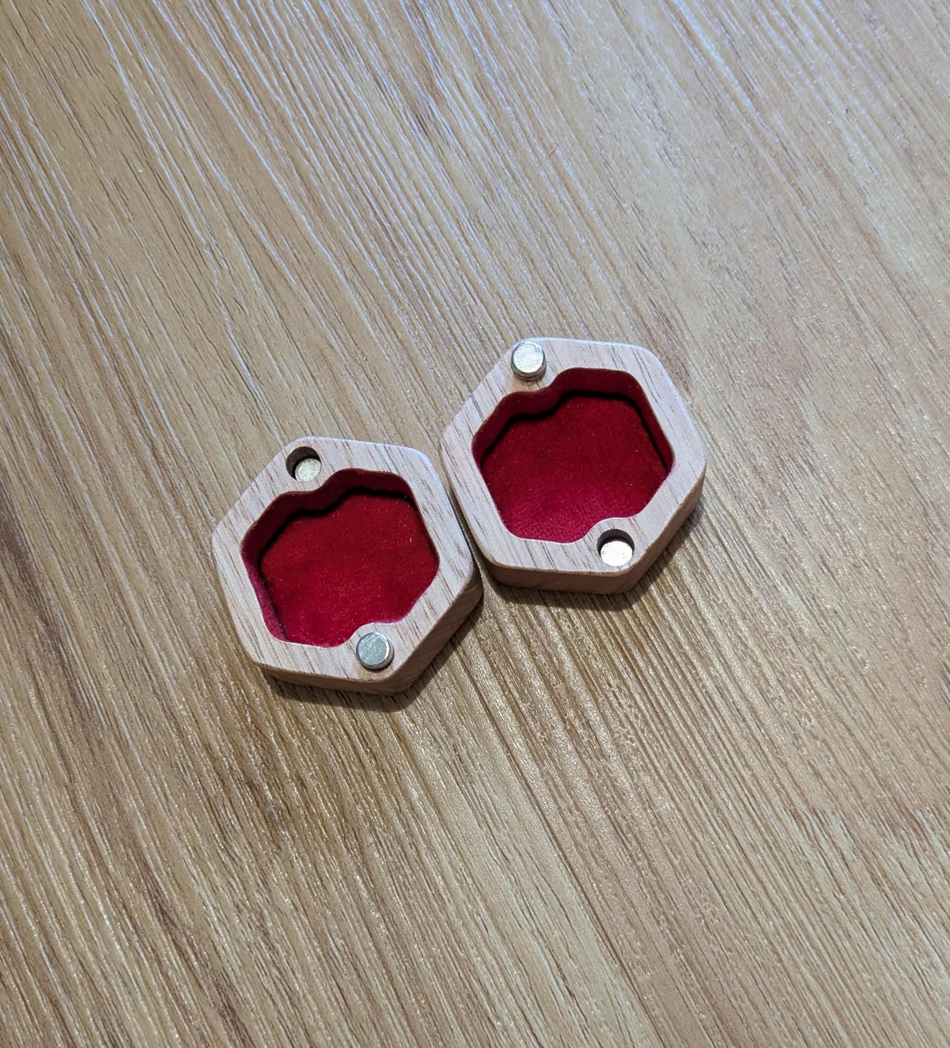 Our updated version of this box is a two-piece hex-shaped box that is flocked and velvet-lined. The box has a fully removable lid with magnetic pins to align the base and lid, and hold the box firmly closed when sealed.
